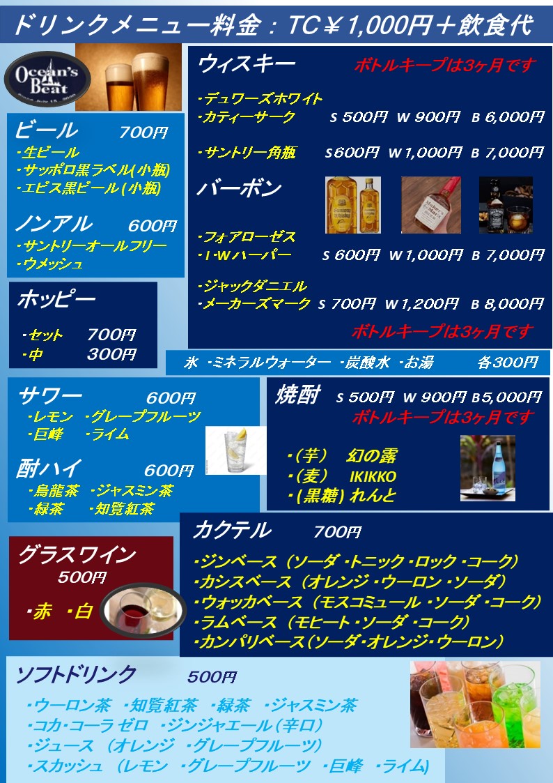 Drink&Food 料金:TC1,000円+飲食代(ボトルキープは6ヶ月)